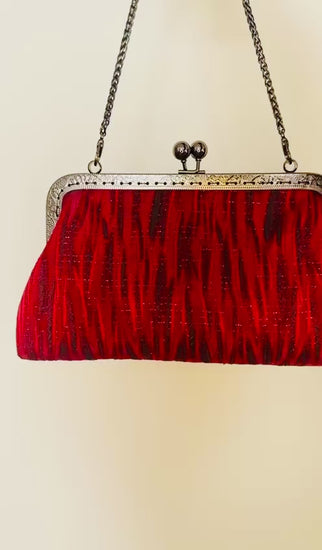 Add instant elegance to any outfit with this luxurious red evening clutch. featuring shimmering textured fabric, a vintage-engraved metal frame, and a detachable chain strap, it's the perfect accessory for weddings, parties, and special occasions. Spacious enough for your essentials and designed to stand out this stylish clutch is ideal for women seeking a chic and timeless evening bag.