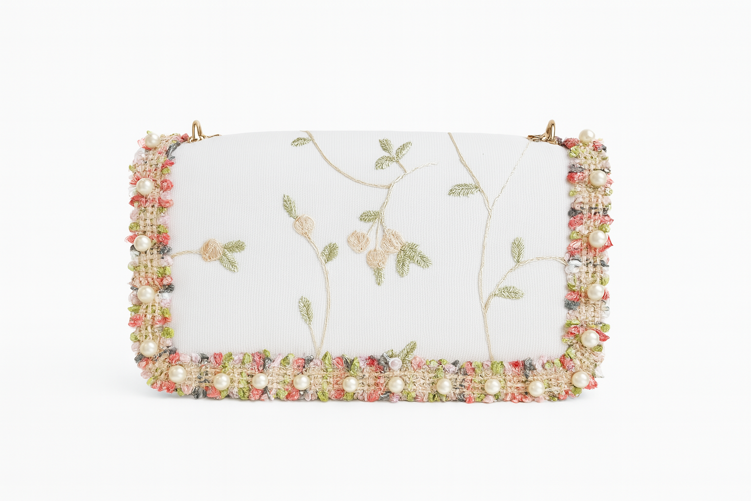 A pastel-toned woven trim embellished with lustrous pearls and colorful threads frames the edges, adding texture and charm to every angle. The structured silhouette provides a polished look, while the gold-tone chain strap offers a modern contrast and versatile styling options – wear it as a shoulder bag or chic crossbody.