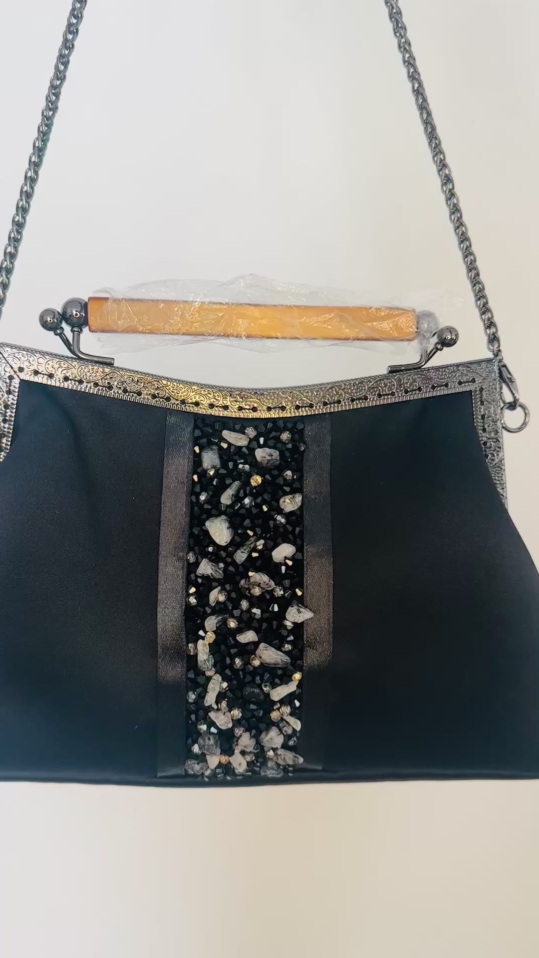 The centerpiece of this bag is its hand-embellished crystal panel, showcasing a blend of black, silver, and clear gemstone accents that create a dazzling, textured finish. Perfect for special events, weddings, galas, or any occasion where you want to shine.