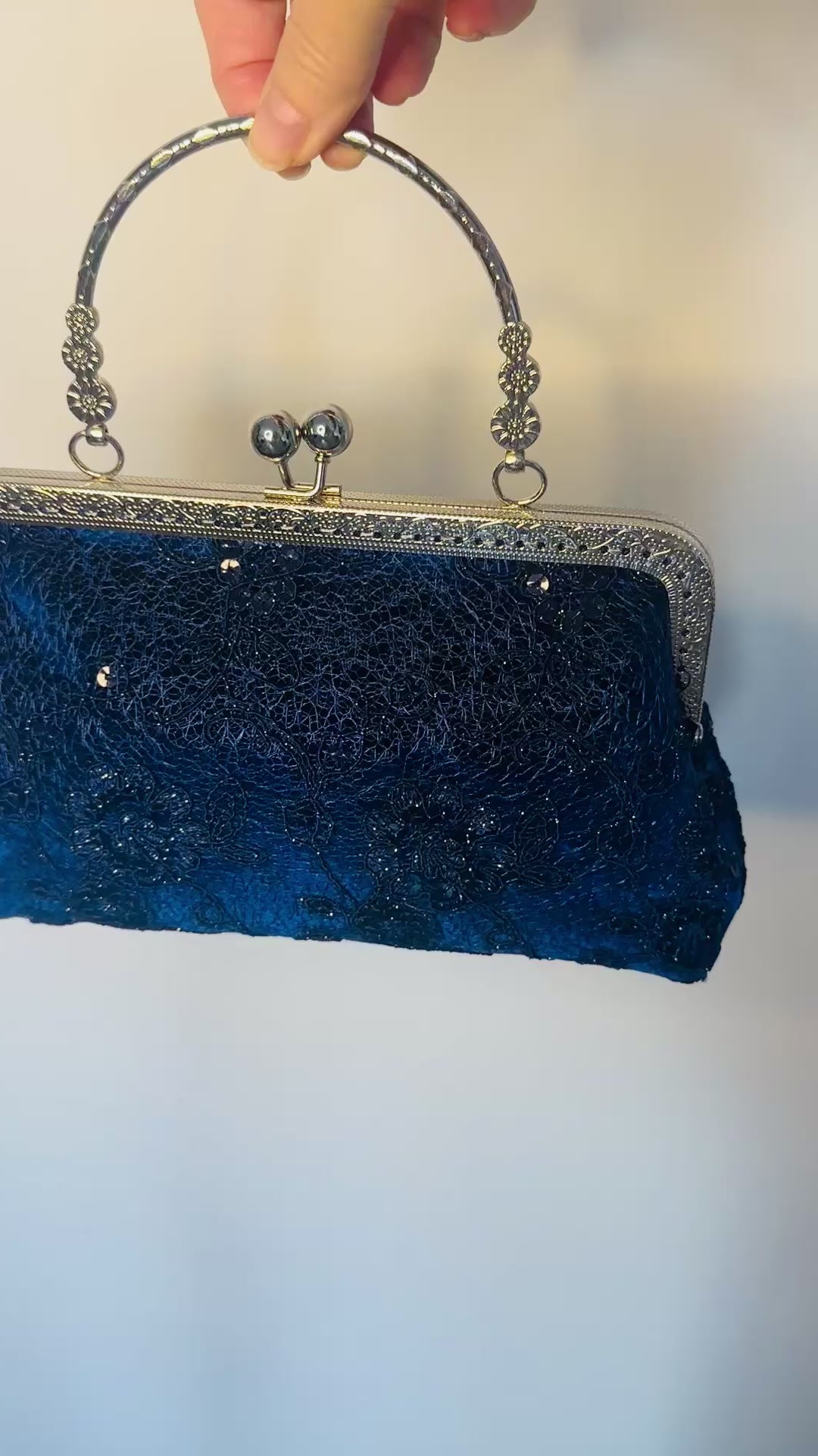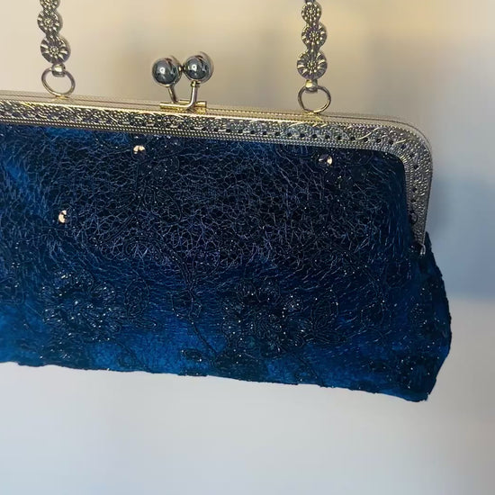A luxurious handmade dark blue clutch bag featuring sparkling elements and elegant lace detailing. Perfect for weddings, galas, and evening events, this navy evening clutch adds a sophisticated shimmer to any formal or glam chic outfit while keeping your essentials stylishly secured.